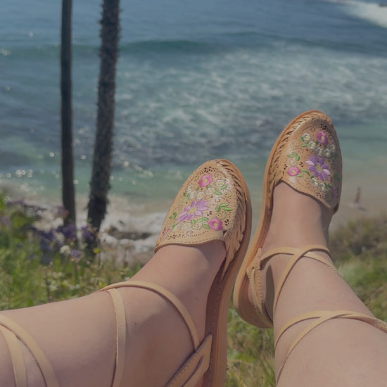 Bring the beauty of a Mexican garden to your every step. Our Divina Herencia Co "Jardín" huaraches are handcrafted from premium natural-toned leather and feature intricate hand-embroidered lavender sunflowers, pink blossoms, and delicate greenery. The elegant lace-up ties wrap around the ankle, offering a customizable look that is both timeless and trendy.