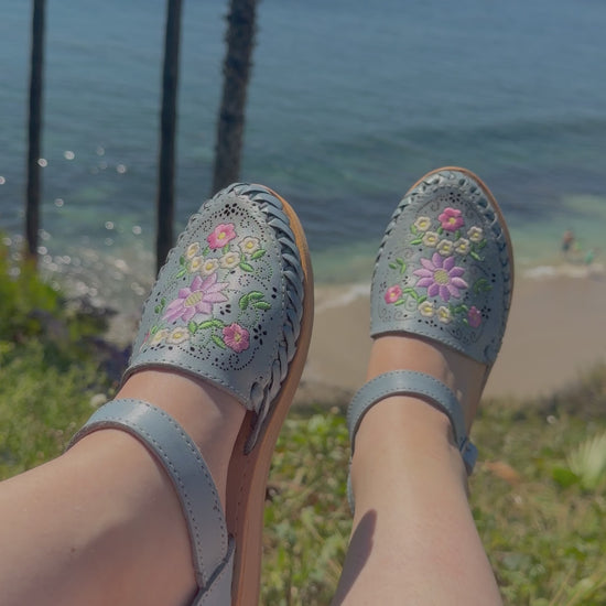 Cielo Floral Embroidered Dusty Blue Leather Huaraches